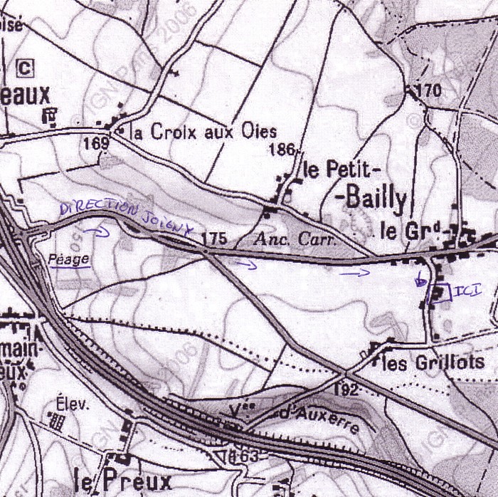 Pour ces deux itinéraires après le péage prendre la direction Joigny . Vous arrivez alors au hameau du Grand Bailly et vous prendrez la première à droite direction « les Grilots ». Nous nous trouvons dans cette rue, au n°31 .